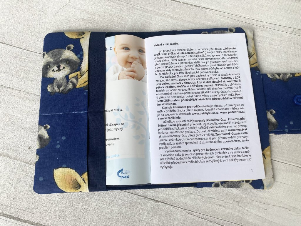 Bavlněný vyztužený obal s motivem.Vyhovuje standartní velikosti očkovacího průkazu.